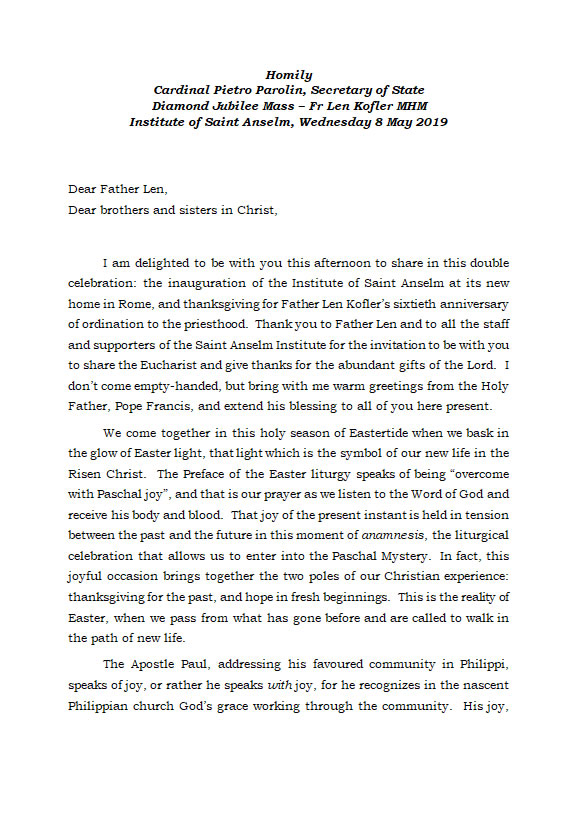 The Homily of Cardinal Pietro Parolin, Secretary of State, given on the occasion of celebrating Fr. Len Kofler’s 60th Jubilee of Ordination and the Opening of the Institute of St. Anselm in Rome